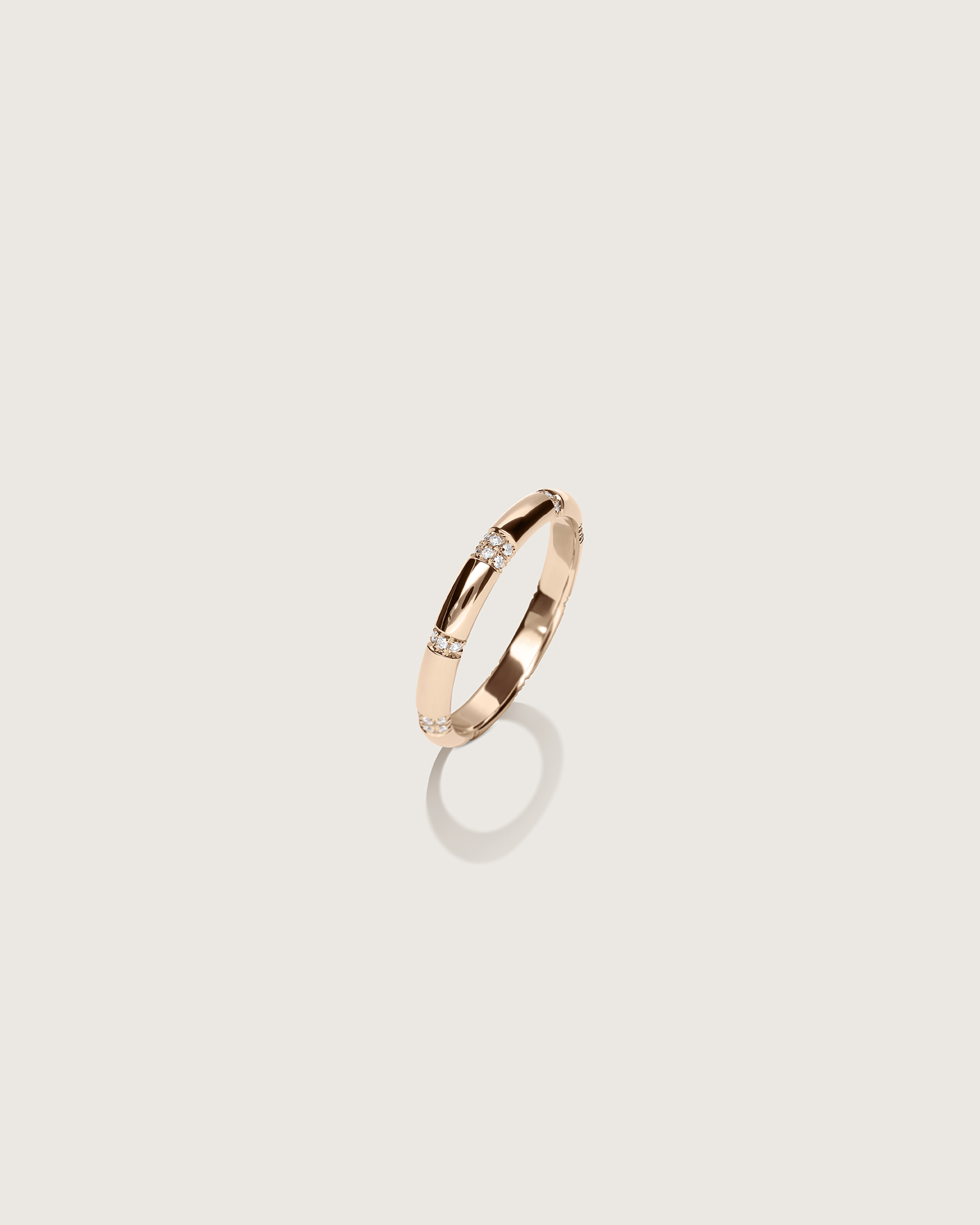 The Zulu ring is an abstract and minimal interpretation of the Zulu bangle. A simple half rounded 18 karat golden band is engraved and adorned with white diamond patterns. Personalize by choosing your coloured gemstones and setting pattern: white diamonds, black diamonds, dark nude diamonds and blue sapphires or a mix. Choose your colour gold and engrave if you feel like it.